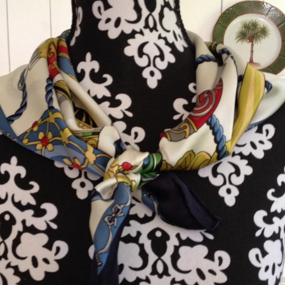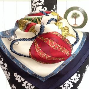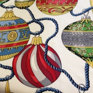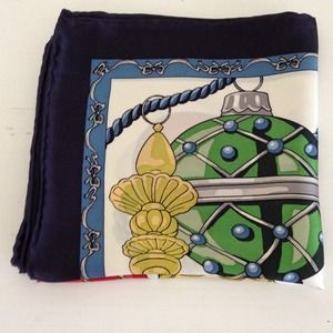 100% silk, 26" square, muticolor ornaments with navy border, excellent condition, buy now and save for self or a beautiful holiday gift
