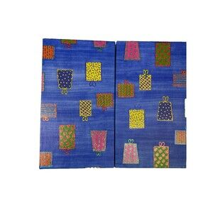 Set of two rectangular gift boxes with bright blue background and colorful present pattern all over. Lids lift off; plain white interior. Great for holiday gifting, birthdays, or storage.