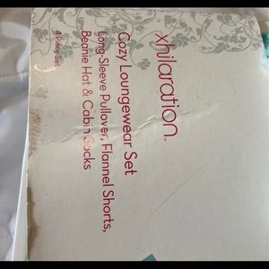 Flannel shorts , sequins and turquoise sweat shirt or pj top, long socks and beanie , NEW attached in box size women’s large