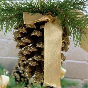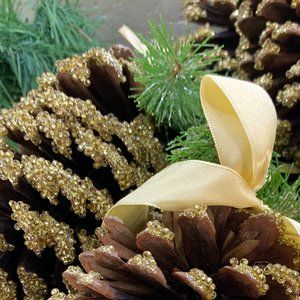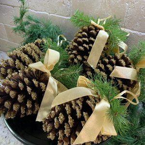 Set includes 6 various natural pine cones. All have green branch accents, gold satin ribbon and bows for hanging. Sizes vary from 3.75" to 6"