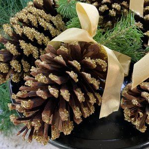 Glitter pine cone ornaments! Loaded with gold bead glitter, these will bring a little glamour to your tree!