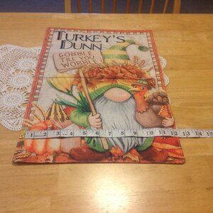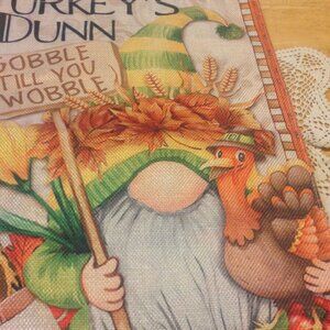 Gnome art Garden flag, nwot. No shepherd's hook included, flag only. 12" x 18". Flag says "Turkey's Dunn. Gobble til you wobble". Great fun for Thanksgiving party decor.
