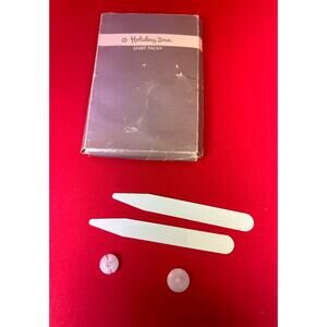 Still in good condition for the age. It has the original two plastic collar stays and two plastic buttons. One button is damaged. Instructions are printed on the inside of the box. The box has some damaged edges.