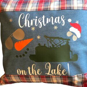 Holiday Lake Scene Pillow Cover: Appliqued Christmas on the Lake w/Pontoon 18x18