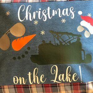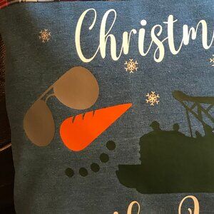 Christmas on the Lake denim pillow cover, 18 x 18 inches. This upcycled pillow sham is made completely from recycled fabrics including jeans and a plaid shirt. A fun lake graphic is appliqued on the front including pontoon boat, snowman face, and Santa hat. The back has an envelope-style closure. This would be a great addition to your lake house or cabin for the holidays this year!