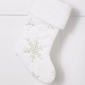 Festive snowflakes, outlined with sparkling sequins, lend a fresh and magical feel to this snowy white plush stocking from Holiday Lane.