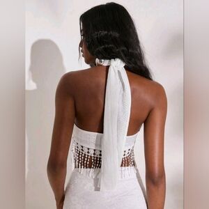 Holiday Patchwork Cross Tie Water-Soluble Lace Tassel Hem Crop Tank Top