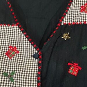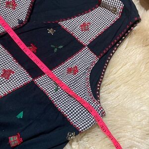 Embrace the festive season with this delightful patchwork vest, featuring charming holiday motifs. The black and white design adds a classic touch to your winter wardrobe.