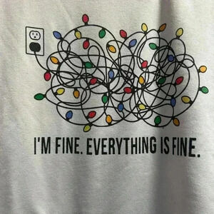 Get into the holiday spirit with this festive raglan sweatshirt featuring red sleeves and a humorous “I’m Fine. Everything is Fine.” tangled Christmas lights design on the front. In size M, this cozy top combines holiday cheer with a touch of humor, perfect for casual gatherings or just relaxing at home. Embrace the holiday chaos in style with this playful sweatshirt!
