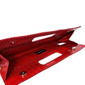 Featuring a magnetic closure and foldable design, this clutch is both practical and stylish. The crocodile pattern accents complement the exterior and red canvas lining, creating a cohesive and eye-catching look. Ideal for Christmas, New Years Eve, Valentines Day, or any holiday event, this clutch is a must-have for any fashion-forward woman.