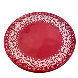 A durable and festive 11-inch melamine dinner plate set of 4 with a vibrant holiday red base. Featuring a decorative white winter-inspired border that includes snowflakes and geometric patterns, perfect for holiday or casual dining. Suitable for indoor and outdoor dining.