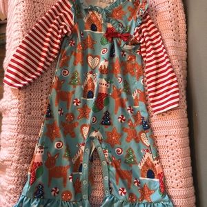 Three holiday rompers, worn once each, no holes, no tears. Long sleeved. Button crotch. Two our little Millie brand, third is Penelope plumm. Ruffles at neck and feet.