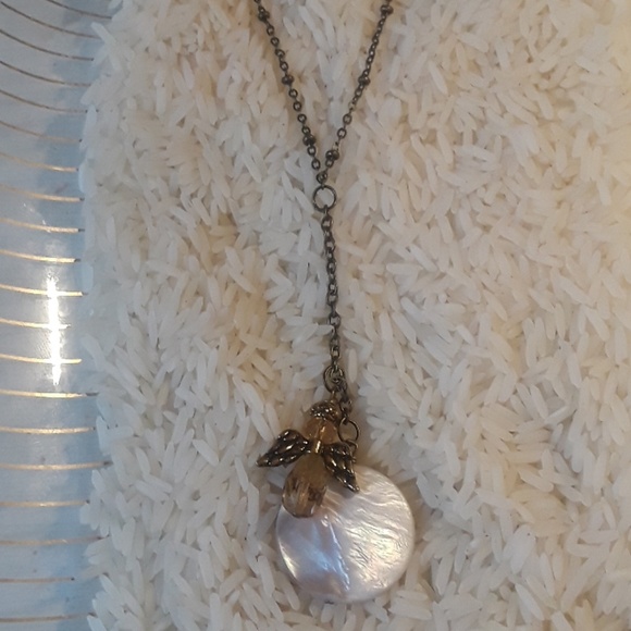 Handmade & designed by Helen Flatmo in Palo Alto, CA. Purchase includes gift box. Beautiful, one of a kind Angel made with a Vintage glass bead and a jewelry finding as a crown. The moon is a shell. Each shell has different color and shell that has natural surfacing. It is a drop pendant necklace in 18" antique oxidized metal ball chain. This elegant, pretty piece can be worn with jeans and a t-shirt and a sweater and a dress. A very versatile necklace for your wardrobe. I give 10% to charity.