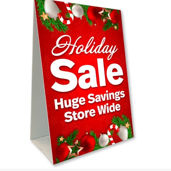 Festive red holiday sale sign with decorative elements. Perfect for store promotions.