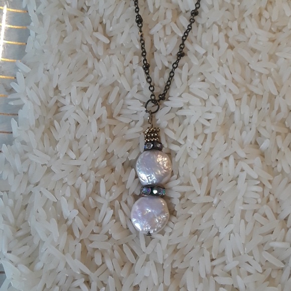 This beauty comes with an 16" or 18" antique gold toned ball chain(Comment 16 or 18" below)and two freshwater pearls. And the crystal channel details and gold jewelry findings add femininity and romance to this piece. The pearls have a pink and lavender tone to it. The pearls are prettier in real life. This festive necklace would make a great Christmas gift for both child and adult! Buy one, give 10% of sales to charity.