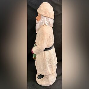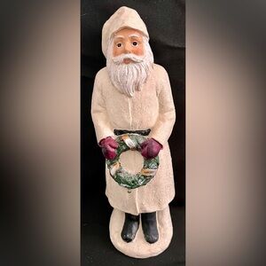 Celebrate the season with this charming Santa figurine, featuring a classic cream outfit and a festive wreath. Perfect for adding a touch of holiday spirit to your home decor. The Santa is made of a lightweight material and is covered in glitter that resembles snow. I took photos of two yellow spots in his attire and a photo of green that appears to have dripped from his wreath. He is about 11”x4” and has a serene presence. Please