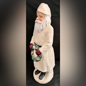 Holiday Santa Figurine with Wreath Sparkling Snow Winter Christmas Gift White