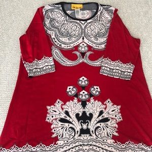 This Ella Samani tunic style shirt is super cute for any holiday party. Beautiful rhinestones adds the perfect sparkle and bling! Pair it with black leggings and boots! Sleeves are 1/2 length.