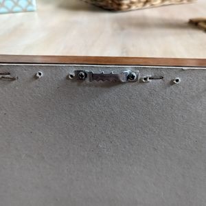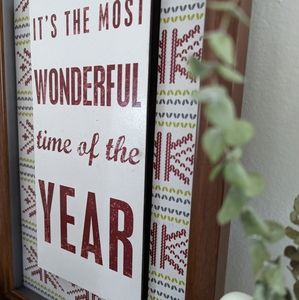 Christmas sign with "It's the Most Wonderful Time of the Year" raised in the center in front of rustic holiday backyard image. 11.5" x 17.5" with wood-look frame. Can be propped up or hung on the wall.