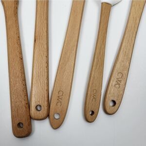 NWOT (New without Tags) Holiday Silicone "Glove" Spatula Set (5) - Turquoise, Green, Peach, White. The set of 5 includes 2 regular-shaped spatulas and 3 spatulas shaped liked gloves or mittens. Holiday/Christmas designs say Merry Christmas and also "Joy, Love, Peace, Believe, Christmas." The 3 "mitten shaped" spatulas are the CWC brand and the largest of those has measuring conversions on the back. The 2 turquiose spatulas do not have brand names. None of them have been used before and they all come as a set.