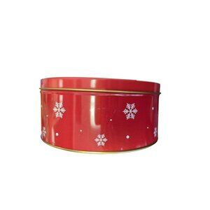 The snowman, adorned with a charming top hat, stands amidst a winter wonderland on this delightful tin. It's a perfect storage solution for your holiday treats, evoking memories of snowy days and festive cheer. The bright red exterior, sprinkled with snowflakes, adds a touch of whimsical charm to any kitchen.