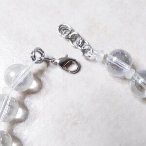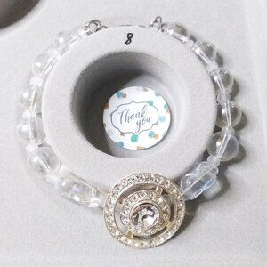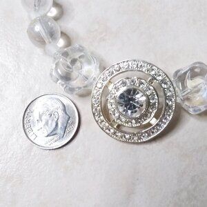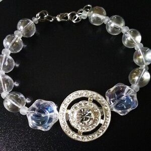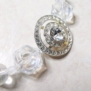 This one-of-a-kind bracelet is pure holiday glam—crafted especially for larger wrists (7.5–8") and designed to dazzle. The centerpiece is a vintage rhinestone button that sparkles like a frosted snowflake, surrounded by shimmering Aurora Borealis glass beads and frosted white seed beads.