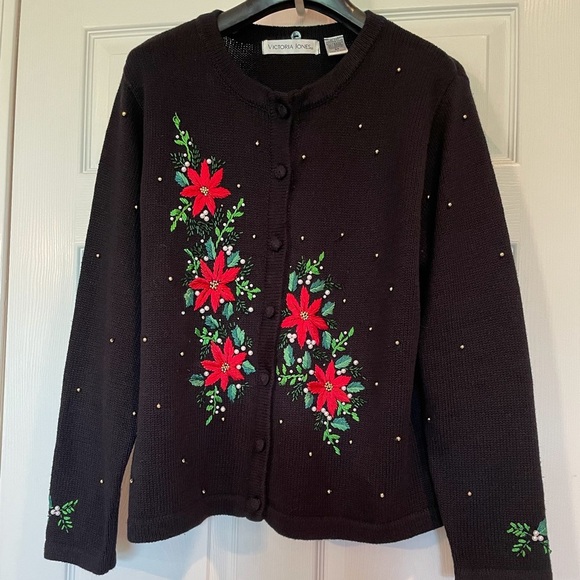 Holiday Sweater Cardigan Beautifully Embroidered w/Faux Pearls & Gold Beads