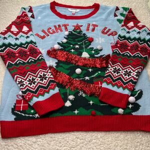 Holiday Sweater Light It Up XXXL 21. Preowned and in great condition. Worn one time for holiday party. Blue with red trim, Christmas tree on front with garland and decor. Please see all photos. Approx measurements in pictures.