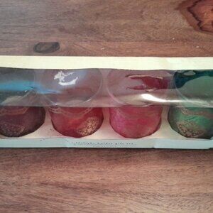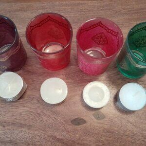 Enjoy these four frosted, festive and fun glass candle holders in purple, red, pink, and green decorated with sparkly gold designs. They're each 2.5" inches tall. New, unused and in original box with four unscented tealights included. Fragrance free; beauty full.