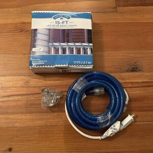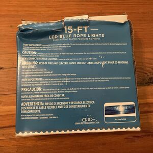 Unused 15 foot blue LED rope light by Walmart's Holiday Time. Comes in original box, with instructions and clips. The box has some damage to it from storage but the lights are still wrapped and unused. Tested and verified to be in working order. See photo.