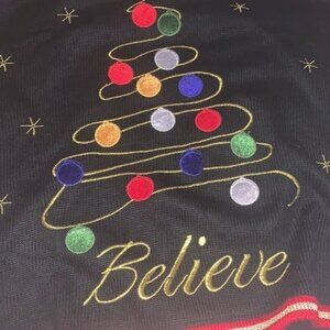 This festive sweater features a delightful Christmas tree design with colorful ornaments and the uplifting word "Believe." Its acrylic fabric offers warmth and comfort, making it a cozy choice for the holiday season. The striking red and black color scheme adds a touch of vibrant cheer to your wardrobe.