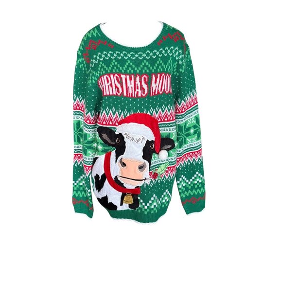 Holiday Time Christmas Moo Cow Ugly Sweater Green Red Medium M (38-40) Acrylic K