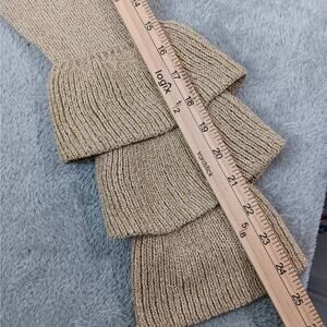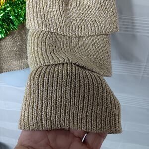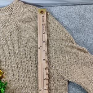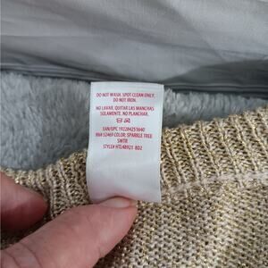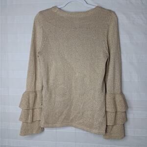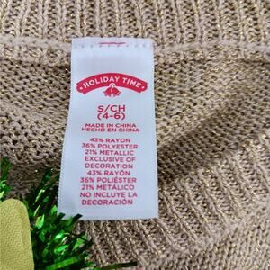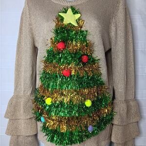 Holiday Time Dimensional Christmas Tree Ugly Sweater Size Small 4 /6 with Ruffle Sleeves. Christmas tree made with green and gold colored garland, colorful pompoms and a felt star. Sweater base is beige with lots of metallic shimmering gold thread throughout. Layered ruffle long sleeves.