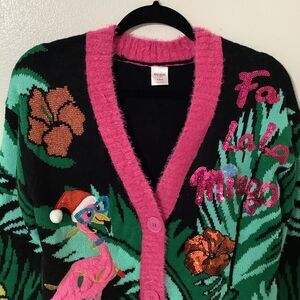 Holiday Time Fa La La Flamingo Kitsch Ugly Colorful Christmas Sweater Cardigan S