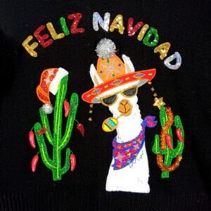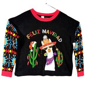 Holiday Time "Feliz Navidad Llama" Graphic Black With Colorful Sleeves Size XL
