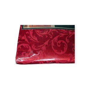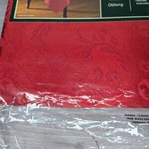 NWT Holiday Time Matching oblong table cloth & 5 chair covers in a red embroidered pattern.