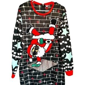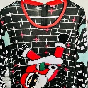 These absolutely adorable, Holiday Time, Light Up, Break Dancing Santa Claus, one piece Ugly Pajamas are unisex and in good pre-loved condition. Lights work great, battery pack stores nicely in the pock with on/off switch. There are some fuzz balls that will easily come off with a sweater shaver I started shaving these but my sweater shave broke in the process. Otherwise, No flaws or imperfections that I could find.