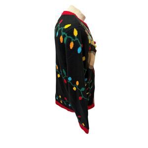 Stand out this holiday season with this bold and festive Holiday Time men’s sweater in size Large (42–44). Features a reindeer face design with red glitter sunglasses, 3D Christmas tree antlers, colorful pom-poms, jingle bell collar accents, and vibrant holiday lights across the shoulders and sleeves. Black knit base with red trim at the neck, cuffs, and hem. Perfect for ugly Christmas sweater parties, office contests, or seasonal celebrations. Pre-owned, excellent condition with no noted flaws.