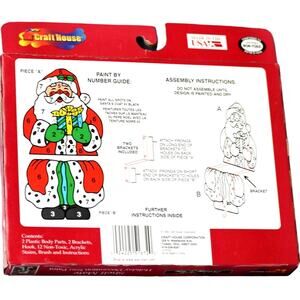Holiday Time Santa Claus Shelf Mate to paint & assemble. Plastic figure sits on edge of shelf or mantel piece. Open space in Santa's "lap" can hold greenery, votive candle, ornaments or other seasonal decorations. Comes with 2 body parts, pair of brackets to join them, 12 colors of non-toxic acrylic paints, instructions and hook for hanging stockings.