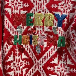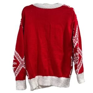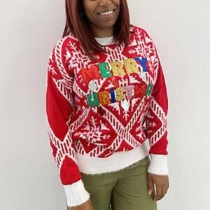 Holiday Time Women's Plus Size Medium (8-10) Merry Christmas Fairisle Ugly Sweater Crewneck; pullover styling. Relaxed fit Red and white snow flake pattern soft hairy fabric, with