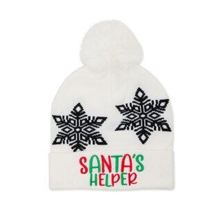 Stay warm and festive with the Holiday Time wearing this Women's Santa's Helper Pom Pom Beanie Hat in Winter White. This stylish winter hat features a playful pom pom detail.
