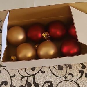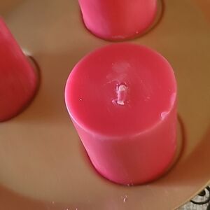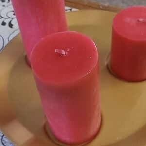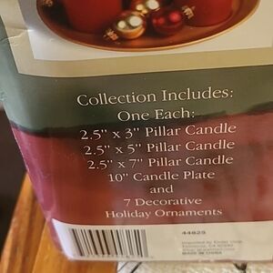 Enhance your home decor with this elegant red candle set. The candles are beautifully displayed on a gold tray, adding a touch of sophistication to any room.Also cones with 7 mini decorative ornaments to add a festive touch.