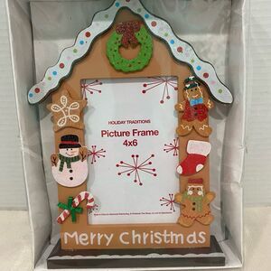 Holiday Traditions Picture Frame 4x6 Merry Christmas. Never Used. Please reference attached pictures for colors, figures, picture size recommendations and condition.