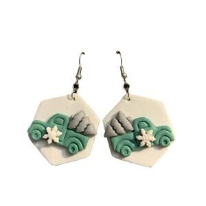 These earrings for the holiday season combine an iconic up truck with silver Christmas tree in the bed and snowflake on the door. They're created with a subtle color palette of white, light green and silver.