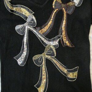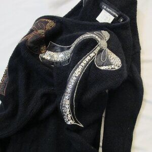 I B Diffusion black silk/angora blend sweater with gold, copper, and silver sequined bows. One silver bow goes over left shoulder and down left sleeve. Stunning for an evening party! Lightly worn, with dry cleaning tag.