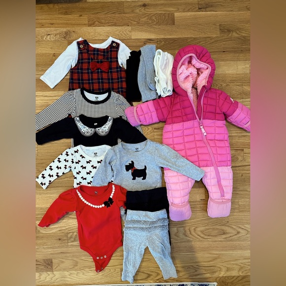 Five long sleeve onesies, three pairs of tights, two pants a dress/shirt combo and winter snow suit. Snow suit has mild stain on neck.