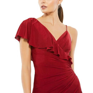 Ieena For Mac Duggal Asymmetric V-Neck Ruffled Cap Sleeve Gown in Wine. Size 4. Features asymmetric V-neck, single ruffled cap sleeve, spaghetti strap, ruched waist, thigh-high side slit, sweeping train, concealed side zipper closure, and maxi length. Style 11257. 100% Polyester. NWT / New with tags.