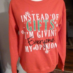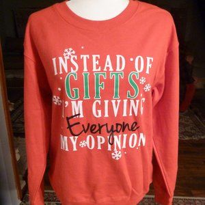 Wound Up / Holiday Red sweater /top with wording " Instead of Gifts I 'm Giving Everyone My opinion "