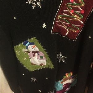 Festival holiday sweater. In GUC, just a few stray cat hairs and some pilling on the snowman patch! Runs a big big in my opinion.