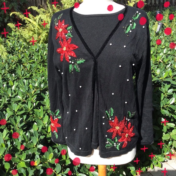 Holiday faux cardigan sweater (designed to look like a twin set) with velvet trim and sequin poinsettias with pearl detail; very good preloved condition; medium fits a size 10